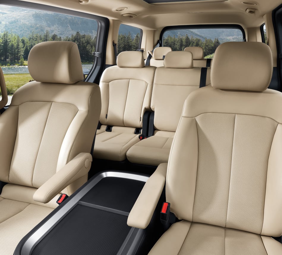 Пассажирский фургон удобен и безопасен. Задние сидения складываются, что позволяет транспортировать грузы. Автосалон имеет модификации для размещения 9 или 11 пассажиров. Есть несколько USB-портов для гаджетов.